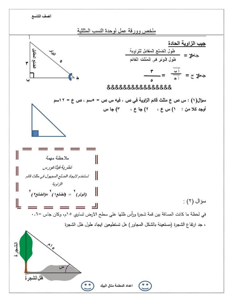 ورقة عمل وحدة النسب المثلثية للصف التاسع الفصل الثاني منتديات صقر الجنوب